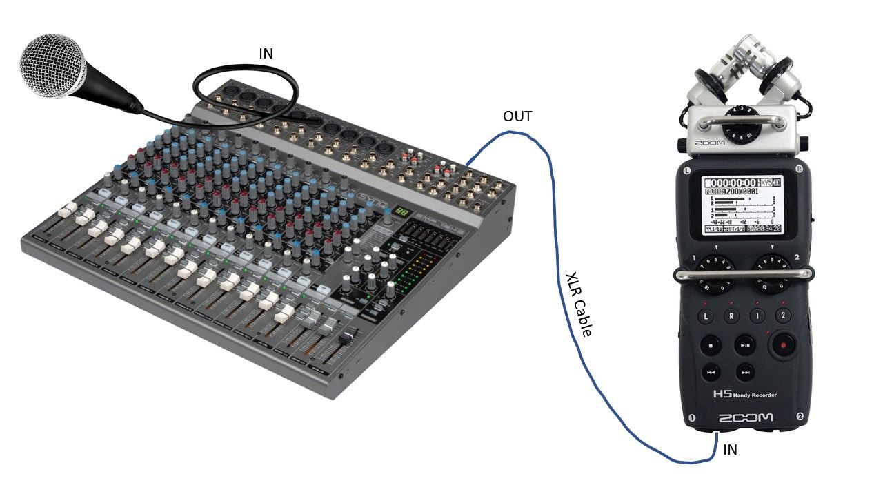 For the second option, you'll need to ensure that the mixer has an extra cable output to be plugged into your portable audio recorder input. Refer to the illustration below for better understanding: